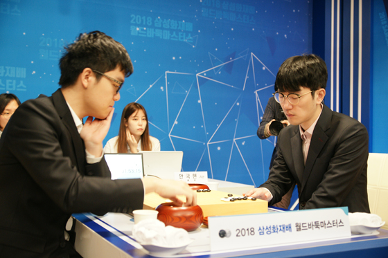 ▲안국현 9단(오른쪽)과 커제 9단의 지난해 삼성화재배 월드바둑마스터스 결승 대국 장면