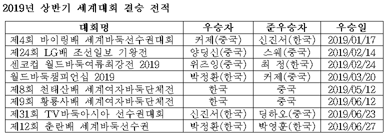 신진서 9단은 지난 6월 23일 열린 제31회 TV바둑아시아선수권 결승에서 중국의 딩하오(丁浩) 6단을 꺾고 입단 후 첫 국제대회 우승을 달성했으며, 박정환 9단은 6월 27일 제12회 춘란배 세계바둑선수권 결승에서 박영훈 9단을 2-0으로 제치고 네 번째 메이저 세계대회 챔피언에 등극했다.