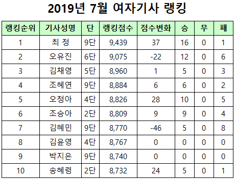 2019년 7월 프로기사 랭킹 보기 (클릭)