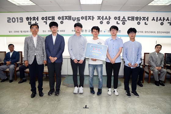 여자정상팀의 초대 우승으로 막을 내린 2019 합천 역대영재 vs 여자정상 연승대항전 시상식이 9일 한국기원 2층 대회장에서 열렸다.