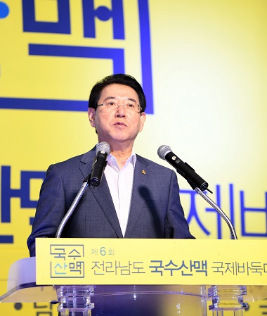 ▲축사를 하고 있는 김영록 전라남도 도지사6회 국수산맥 국제바둑대회는 3일부터 5일까지 3일간 전남 신안, 영암, 강진을 순회하며 ‘세계프로최강전’과 ‘국제페어대회’, ‘국내프로토너먼트’ 등 <프로바둑대회>와 <국제 청소년바둑대축제>로 나뉘어 열린다.