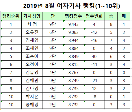 여자기사 중에서는 최정 9단이 지난달과 마찬가지로 23위에 올랐고 오유진 9단은 92위를 기록했다.