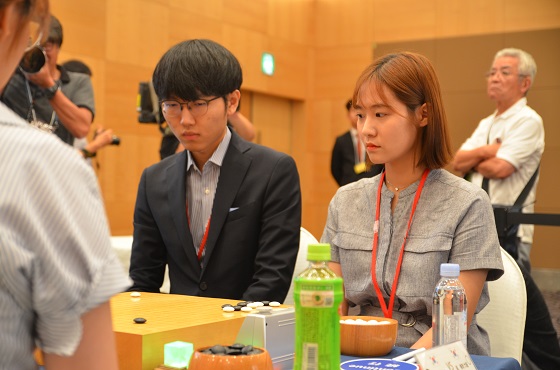 ▲2019 세계페어바둑최강위전 최강위결정전이 벌어지는 모습(사진제공-국제페어바둑협회)타이틀 결정전답게 대국은 시종일관 박진감 넘치는 흐름으로 진행됐다. 초반에 신진서 9단․오유진 6단 페어가 앞서갔지만 중반 박정환ㆍ최정 9단 페어가 추격에 성공했고 하변 전투에서 박정환ㆍ최정 9단 페어가 득점을 올리며 우세를 가져갔다. 이후 신진서 9단ㆍ오유진 6단 페어가 맹추격에 나섰지만 박정환․최정 9단 페어가 잘 마무리하며 승리를 확정지었다.