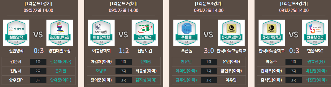 개막식 후 오후 2시부터 열린 1라운드는 인제 설원명작 대 서울 양천대일바둑도장, 부산 이붕장학회 대 여수 진남 토건, 서울 푸른돌 대 순천 한국바둑고등학교, 순천 한국바둑중학교 대 파주 한올 M&C의 대결로 펼쳐졌다. 그 결과, 서울 양천대일바둑도장이 3-0 완승을 거뒀으며, 여수 진남 토건은 2-1로 승리했다. 또한 서울 푸른돌과 파주 한올 M&C은 모두 3-0으로 승리하며 기분 좋은 출발을 알렸다.