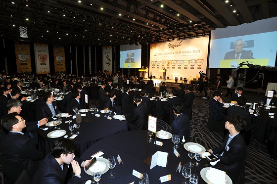 ▲웨스틴조선호텔 그랜드볼륨에서 벌어지고 있는 개막식 전경임채정 한국기원 총재는 개막 인사말을 통해 “갈수록 진화하며 치열해지고 있는 KB리그는 올해부터 일정을 조정해 가을ㆍ겨울 스포츠로서, 그 위상을 더욱 공고히 할 것으로 기대된다. 26일 개막전을 시작으로 내년 3월까지 100여 명 가까운 프로기사들이 고락(苦樂)을 같이할 KB리그는, 우리 바둑계의 젖줄이라고 할 수 있다. 대회에 참가한 선수 여러분도 이 점을 마음에 새기고 충실한 바둑 내용으로 팬들에게 보람을 선사해 주길 당부한다”고 말했다.