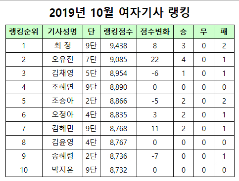 여자 기사 중에서는 최정 9단이 한 계단 떨어진 23위에 올랐으며 오유진 7단이 두 계단 끌어올린 88위를 차지했다.