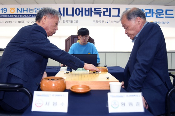 ▲서봉수 9단-승자(왼쪽) vs 황원준 9단신생팀으로서 거함 서봉수 9단을 영입해 기대를 모았다가 첫 경기에서 영패하는 바람에 주춤했던 의왕 인플러스는 2라운드에서 바로 전원 승리하며 반전에 성공했다. 같은 신생팀인 의정부 희망도시는 1라운드에서 승리하고 2라운드에 패해 상반된 처지.