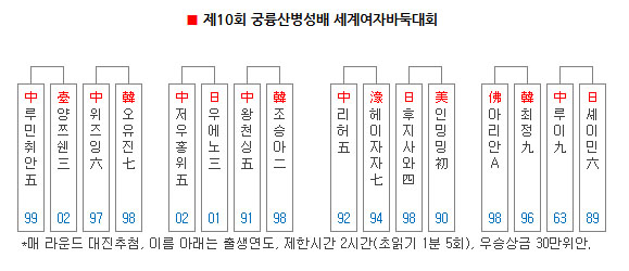 2016년 7회부터 9회 대회까지 3연패를 이어가고 있는 한국은 시드를 받은 최정(23) 9단·오유진(21) 7단과 지난 28일∼30일 열린 대표 선발전을 통과한 조승아(21) 2단 등 3명이 출사표를 올렸다.