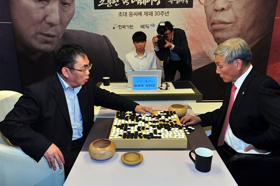 ▲종국 후 두 전설이 국후감상을 주고받고 있다.조훈현 9단은 국후 인터뷰에서 “오랜만에 둬서 얼떨떨하다. 떠나 있어서 감이 하나도 없고 수가 안 보인다”면서 “전성기였으면 더 잘했겠지만 이정도면 잘했다고 생각한다”고 말했다.