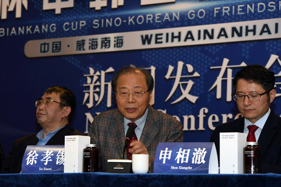 ▲2019 편강배 한ㆍ중 바둑국수 초청전 개막식에서 기자의 질문에 답변 중인 서효석 한국기원 이사(가운데). 왼쪽은 녜웨이핑 9단, 오른쪽은 여자바둑리그 참가팀 EDGC의 신상철 대표