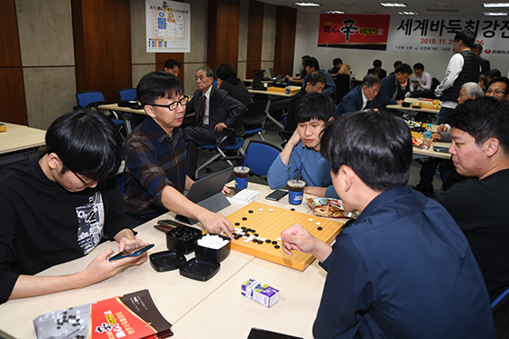 ▲부산 농심호텔 지하에 마련된 검토실이 가득 찼다. 앞줄 왼쪽부터 시계 방향으로 신진서 9단, 국가대표 목진석 감독, 이지현 9단, 홍민표 코치, 김영삼 사무총장 한편 24일 오후 3시부터는 농심호텔 허심청 2층 에메랄드홀에서 강지성 9단의 해설로 공개해설회가 열릴 예정이다.