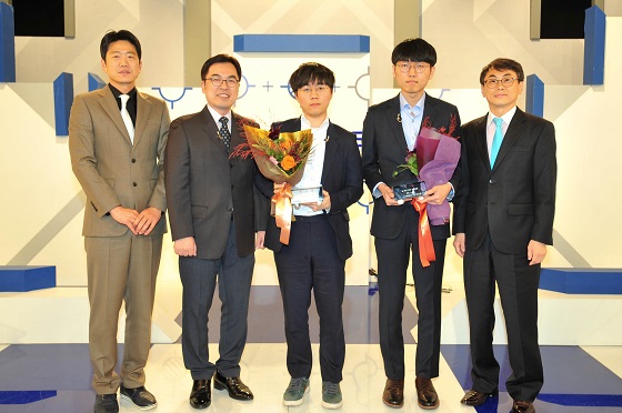 ▲내빈 및 수상자(왼쪽부터) 김영삼 한국기원 사무총장, 장웅 아나운서, 신민준ㆍ신진서 9단, 이기문 KBS 스포츠국 국장