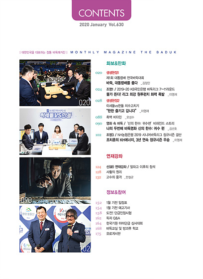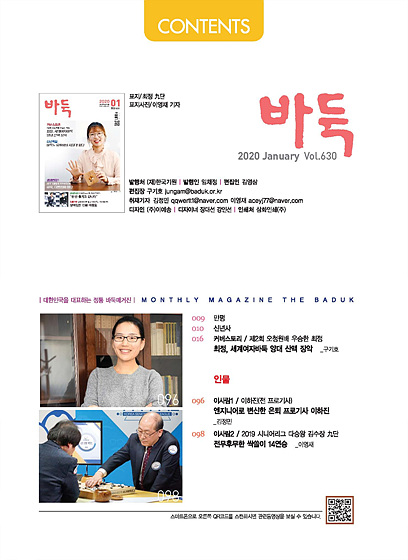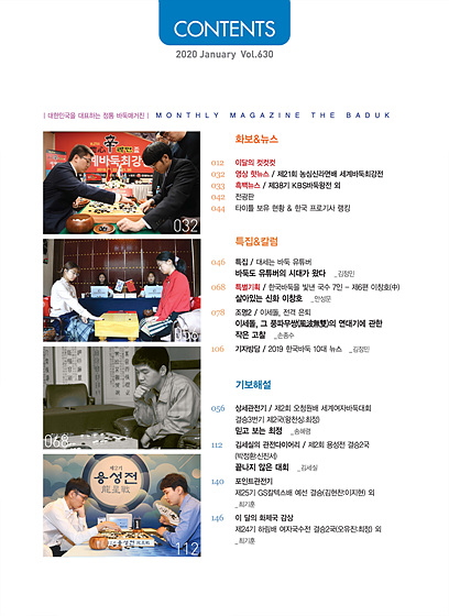 인기코너 [기자방담]의 신년호 주제는 2019 한국바둑 10대 뉴스. 현장을 누빈 기자들의 육성을 통해 다사다난했던 2019년을 돌아봤다. [특별기획/한국바둑을 빛낸 국수7인-이창호(中)]편에서는 ‘살아있는 신화 이창호’를 전격 해부했다.