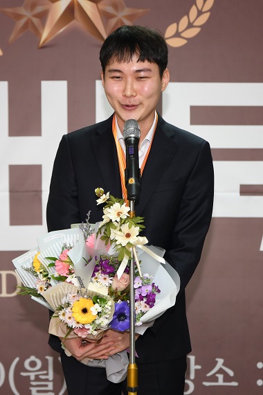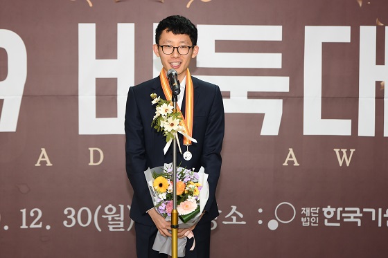 ▲박정환 9단남녀 부문으로 나뉘어 시상된 최우수신인상은 미래의 별 신예대회에서 준우승을 차지하고 글로비스배 U-20에서 8강에 진출한 박상진 4단(남자부문)과 소속팀 부안곰소소금의 2019 한국여자바둑리그 우승에 기여한 허서현 초단(여자부문)이 수상했다.