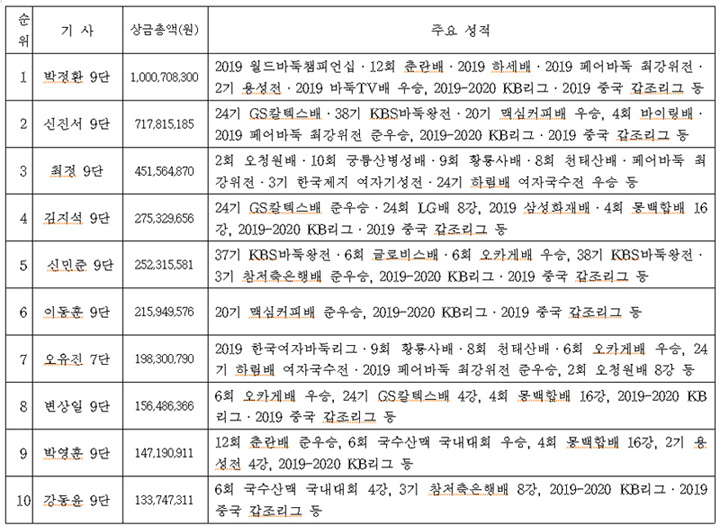 11위에 오른 박하민 7단이 1억 800여 만원을 버는 등 11명이 상금으로만 1억원 넘게 손에 쥐며 억대 소득자 대열에 합류했다. 억대 수입자가 2018년 16명에서 11명으로 준 것은 매년 봄에 개막했던 KB리그가 올 시즌부터 가을 개막으로 변경된 것이 크게 영향을 미쳤다.
