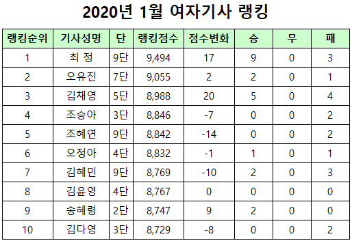 여자기사 중에서는 최정 9단과 오유진 7단이 지난달과 같은 17위와 94위를 기록했다.