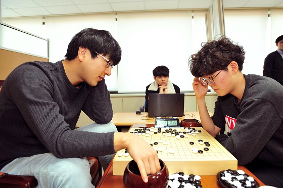 ▲박영훈 9단(왼쪽)이 한우진 초단과 국후감상을 나누고 있다.1999년 12월 입단한 박영훈 9단은 입단 1개월 만에 제12기 현대자동차배 기성전 1차예선 1회전에서 이정원 초단을 꺾고 데뷔 첫 승을 신고했다. 이후 2002년 1월 100승, 2009년 7월 500승에 이어 2017년 8월 KB국민은행 바둑리그 8라운드 3경기에서 윤준상 9단에게 승리하며 900승을 달성했다.