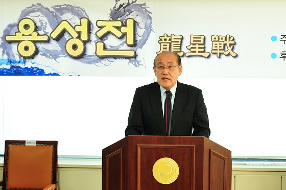 ▲가츠마타 노부아키 일본 바둑장기채널 최고고문이 인사말을 하고있다.지난 2일 막이 오른 용성전 예선은 총 219명이 참가해 일반조 23명, 시니어조 2명, 여자조 2명을 선발했다.