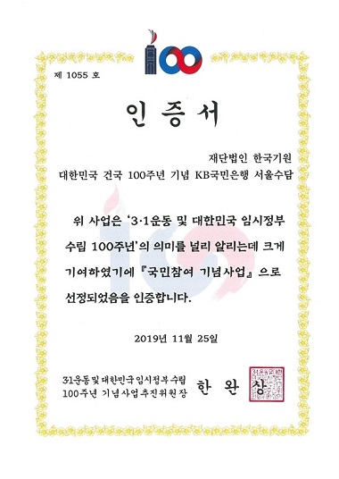 대한민국 건국 100주년 기념 KB국민은행 서울 수담(手談)이 대통령직속 3·1운동 및 대한민국임시정부 수립 100주년 기념사업추진위원회로부터 국민참여 기념사업에 선정됐다.