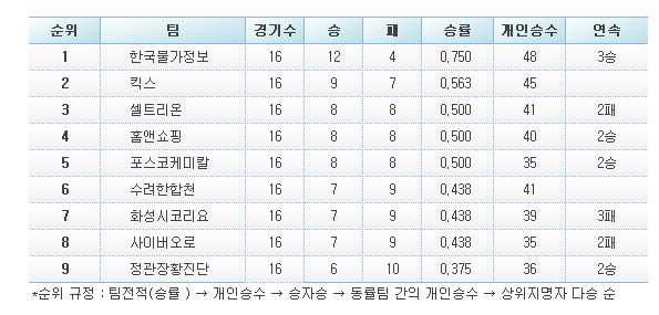 18라운드를 마친 결과 9승 7패의 킥스(Kixx)가 2위를 차지했고 8승 8패를 기록한 셀트리온과 홈앤쇼핑ㆍ포스코케미칼은 개인승수가 많은 셀트리온ㆍ홈앤쇼핑ㆍ포스코케미칼 순으로 3∼5위에 올랐다.