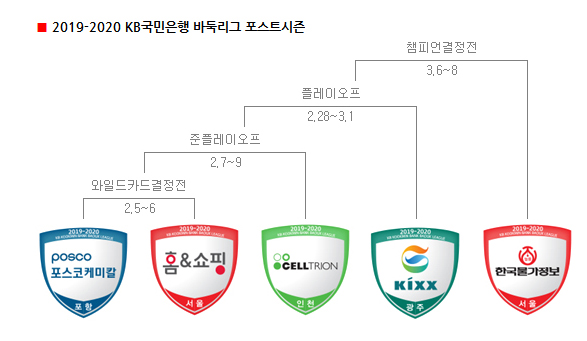 9개팀이 참가해 더블리그로 포스트시즌에 진출할 다섯 팀을 가린 2019-2020 KB국민은행 바둑리그는 내달 5일 오전 11시부터 홈앤쇼핑과 포스코케미칼의 와일드카드결정 1차전을 시작으로 포스트시즌의 막을 올린다. 한편 4일 오후 4시부터는 포스트시즌 미디어데이 행사가 한국기원 2층 대회장에서 열린다.