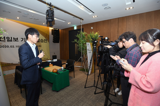 ▲치열한 접전을 마치고 인터뷰 중인 신진서 9단(왼쪽). 결승 2국은 12일 오전 9시 열린다