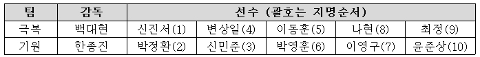 27일 한국기원 바둑TV스튜디오에서 양 팀 감독이 참석한 가운데 열린 선수선발식에서는 극복팀 백대현 감독이 우선권을 얻어 신진서 9단을 지명했다. 이어 두 감독은 팀 당 2명씩 지명해 백대현 감독이 신진서 9단을 비롯해 변상일ㆍ이동훈ㆍ나현ㆍ최정 9단을 선발했으며, 기원팀 한종진 감독이 박정환ㆍ신민준ㆍ박영훈ㆍ이영구ㆍ윤준상 9단으로 팀을 꾸렸다.