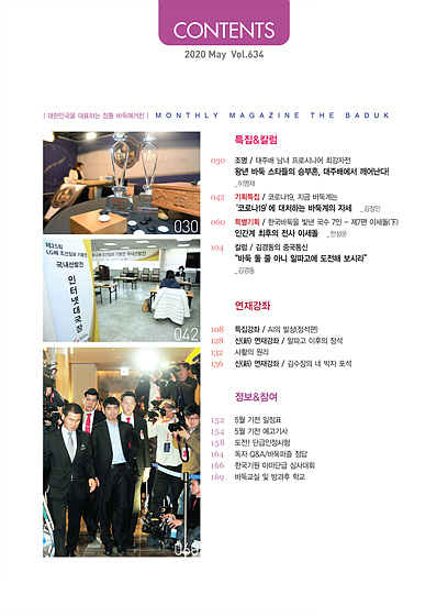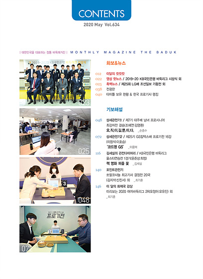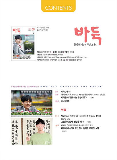 5월호 표지의 주인공은 국내 최대기전 2019-20 KB국민은행 바둑리그 챔피언결정전에서 소속팀 한국물가정보의 우승을 확정지은 주장 신민준 9단. 신민준 9단은 천적 관계였던 신진서 9단의 연승행진을 저지하는 천금 같은 결승점을 올리며 바둑리그 우승과 MVP 수상 두 마리 토끼를 모두 잡았다. 신 9단의 MVP 수상 소감은 [커버스토리]에서 확인할 수 있다.
