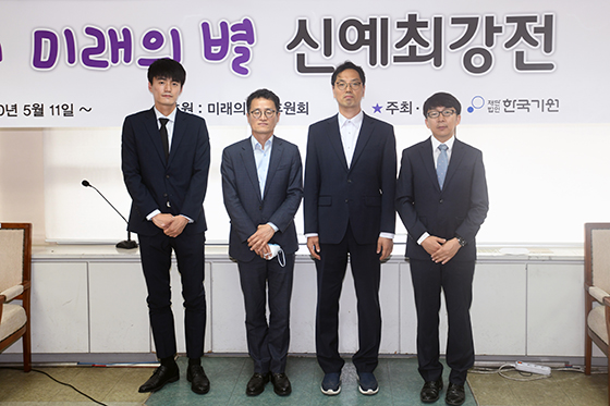 ▲ (왼쪽부터) 심판위원 조인선 4단, 한국기원 양재호 사무총장,미래의 별 후원회 전영동 씨, 국가대표 목진석 감독