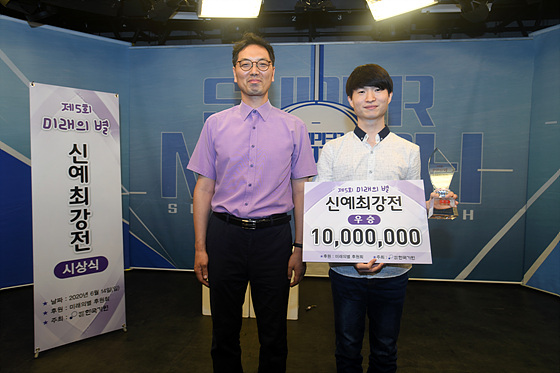 ▲ 미래의 별 후원자 전영동 씨(왼쪽)가 직접 시상을 했다. 우승자 김창훈 3단(오른쪽)은 상금 1000만원을 받았다.