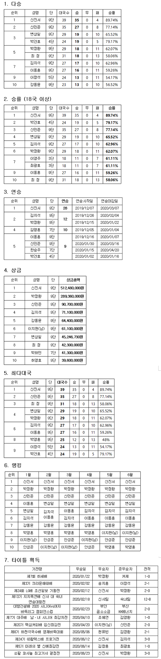 2020년 상반기에는 신진서 9단이 다승ㆍ승률ㆍ연승ㆍ상금ㆍ랭킹ㆍ대국수 등 모든 부문에서 1위를 차지하며 ‘신진서 시대’ 서막을 알렸다.