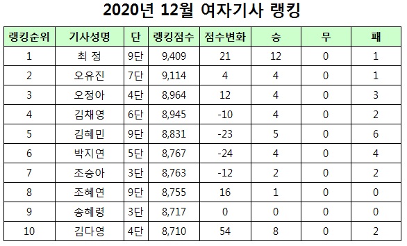11월 한 달 동안 12승 1패로 전체 기사 중 가장 많은 승점을 올린 최정 9단은 전체랭킹에서 다섯 계단 오른 28위에 자리했고, 오유진 7단이 한 계단 점프한 86위를 차지했다. 랭킹점수 12점을 보탠 오정아 4단은 김채영 6단과 자리를 맞바꿔 여자랭킹 3위에 올랐다.