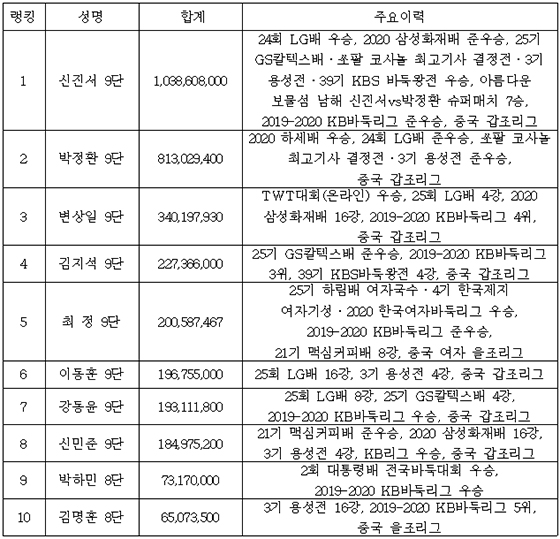 2020년 프로기사 상금랭킹 10걸은 다음과 같다.