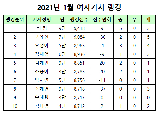 여자랭킹 1위 최정 9단은 전체랭킹에서 한 계단 끌어올린 27위를 차지했고, 오유진 7단이 일곱 계단 하락한 93위를 기록했다.