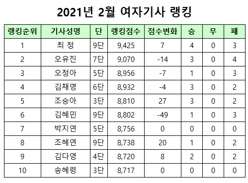 여자기사 중에서는 최정 9단이 지난달과 마찬가지로 27위를 차지했고, 오유진 7단이 여섯 계단 하락한 99위에 랭크됐다.