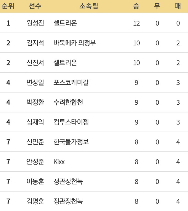 원성진 9단이 파죽의 12연승에 성공하며 바둑리그 다승왕을 확정지었다.
