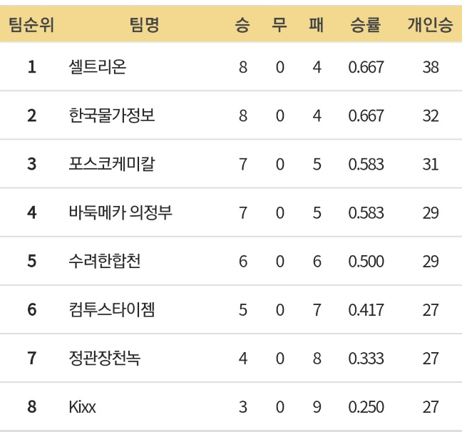 8승 4패의 셀트리온과 한국물가정보, 7승 5패의 포스코케미칼과 바둑메카 의정부가 개인승수 차이로 1∼4위를 기록 중이고 6승 6패의 수려한합천이 5위, 5승 7패의 컴투스타이젬이 6위에 올랐다. 1위 셀트리온부터 5위 수려한합천까지 다섯 팀은 향후 두 경기 결과에 따라 정규리그 우승은 물론 수치상 포스트시즌 탈락까지도 가능해 한 경기 한 경기 살얼음 승부를 피할 수 없게 됐다. 6위 컴투스타이젬도 나머지 2경기를 승리하면 상위팀 결과에 따라 포스트시즌 티켓 획득이 가능하다. 포스트시즌 탈락이 확정된 4승 8패의 정관장천녹, 3승 9패의 킥스는 자존심을 건 탈꼴찌 싸움을 벌이게 됐다.