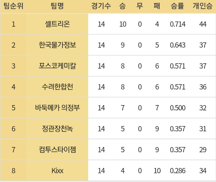 원성진 9단의 활약으로 셀트리온이 디펜딩챔피언 한국물가정보에 3-2로 승리하며 최종성적 10승 4패로 정규리그 1위에 올랐다.