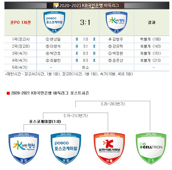 17일 한국기원 바둑TV스튜디오에서 열린 2020-2021 KB국민은행 바둑리그 준플레이오프 1차전에서 포스코케미칼이 수려한합천을 3-1로 꺾었다.