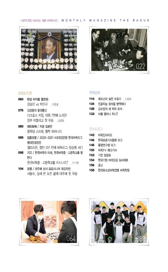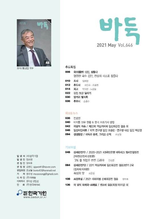 표지에는 4월 4일 영면에 든 한국 바둑의 거목 김인 국수(國手)가 실렸다. 2006년 故 조남철 국수 타계 이후 15년 만에 치러진 ‘한국기원장’의 엄숙한 현장과, ‘영원한 국수’ 김인과 인연이 깊은 명사들의 회고록, 일대기, 업적 등을 [추도특집]에 담았다.