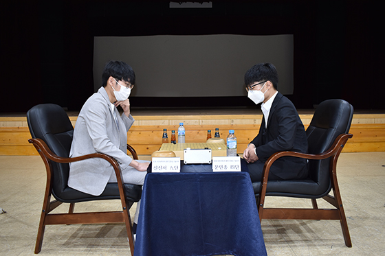▲영재 vs 정상 기념대국을 펼치고 있는 신진서 9단(왼쪽)과 문민종 4단