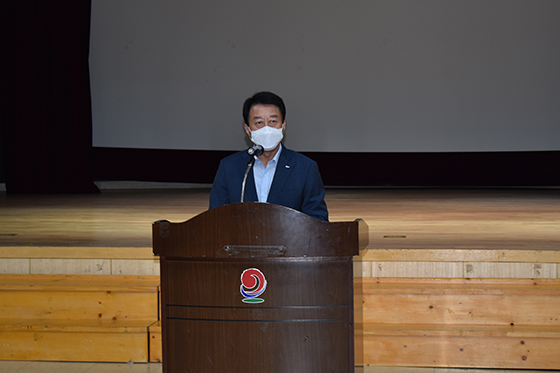 ▲제9기 하찬석 국수배 영재최강전 시상식에 앞서 인사말을 하고 있는 문준희 합천군수