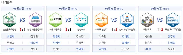 3라운드 현재 김채영ㆍ조혜연 투톱이 팀을 이끌고 있는 삼척 해상케이블카(감독 이다혜)가 3승으로 1위에 올랐고 이어 서울 부광약품(감독 권효진)ㆍ포항 포스코케미칼ㆍ서귀포칠십리(감독 김혜림)가 2승 1패, 섬섬여수(감독 이현욱)ㆍ보령 머드ㆍ순천만국가정원(감독 양건)이 1승 2패를 기록 중이다. 지난 시즌 준우승팀 부안 새만금잼버리(감독 김효정)는 3연패에 빠지며 최하위에 랭크됐다.