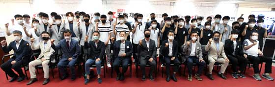 ▲ 조아제약 루키바둑리그 개막식에 참석한 내빈과 선수단이 파이팅하며 선전을 다짐했다