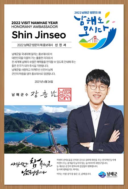 임명패를 받은 신진서 9단은 “아버지의 고향인 남해 홍보대사에 임명돼 정말 영광이고, 많이 부족하지만 제 역량이 닿는 데까지 남해를 홍보할 수 있도록 노력하겠다”는 소감을 전했다.