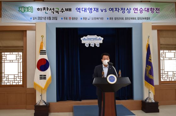 ▲ 2021 역대 영재 vs 여자 정상 연승대항전 개막식 축사를 하는 문준희 합천군수
