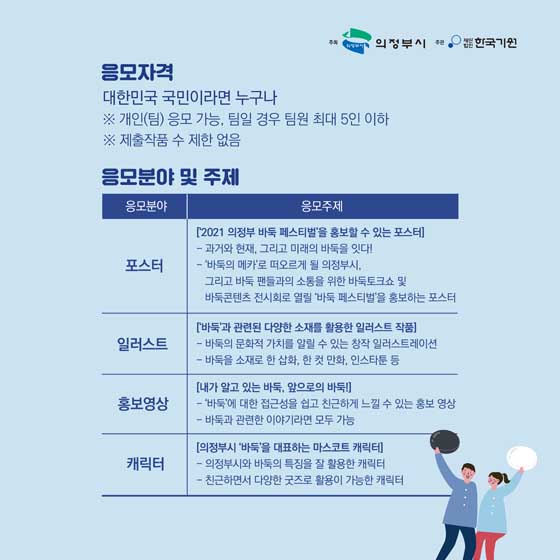 '2021 의정부 바둑 페스티벌'의 일환으로 열리는 바둑콘텐츠 공모전은 포스터, 일러스트, 홍보영상, 캐릭터 등 4개 분야에 걸쳐 응모를 받는다.
