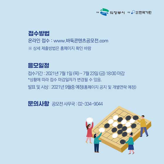 자세한 문의는 공모전 사무국(02-334-9044)으로 연락하거나 ‘2021 의정부 바둑 페스티벌’ 공모전 홈페이지(www.바둑콘텐츠공모전.com)를 참조하면 된다.