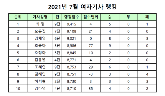 100위권 밖에서는 6월 한 달 9전 전승을 기록한 조승아 3단이 22단계 상승한 124위에 오르며 가장 큰 상승폭을 기록했다.