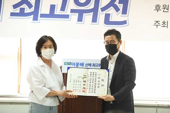 ▲양재호 한국기원 사무총장이 송계순 이붕장학회 회장(왼쪽)에게 故 김영성 이사의 아마6단증을 전하며 사의를 표했다. 송계순 회장은 김영성 이사의 부인이다